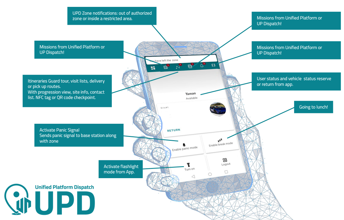 The Unified Platform Dispatch works with The UPD Android app to locate and provide interaction between your base station and your mobile staff.